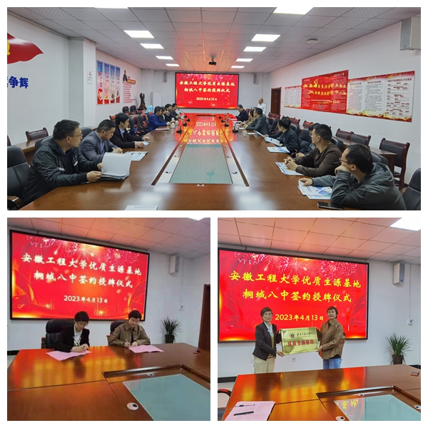 期间,当地政府高度重视,召集相关中学组织召开专题工作部署会,在当地教育部门的精心组织安排下,先后走访了安徽省天城中学、桐城第八中学、安徽省桐城中学、安徽省潜山中学,与安徽省天城中学、桐城第八中学、安徽省潜山中学签订优质生源基地协议书并授牌。