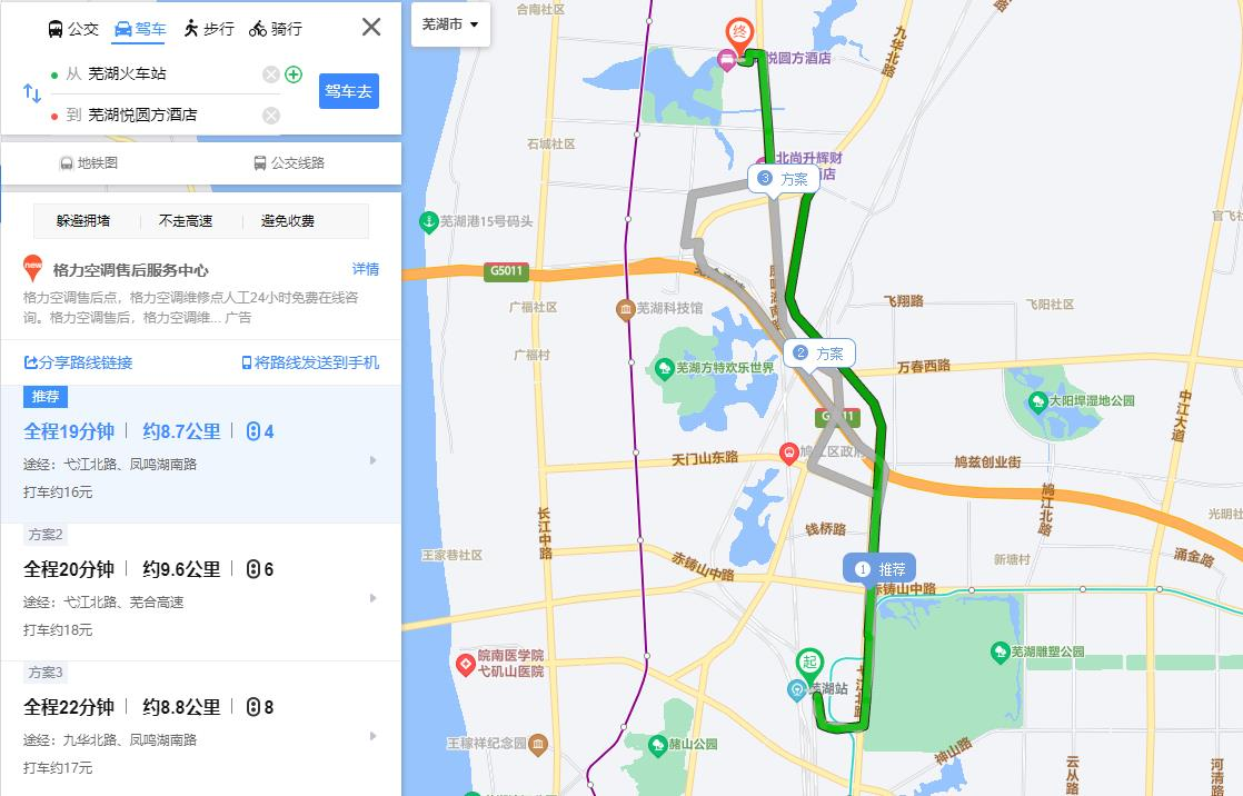 方式三:机场大巴(南京禄口机场至芜湖,约1小时50分钟,发车时间段11:30-22:00,车费65元)+打车(芜湖游客集散中心至芜湖悦圆方酒店,约15分钟,车费20元),全程耗时约2小时5分钟。