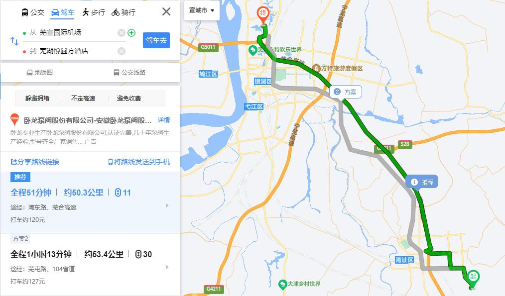 方式二:机场大巴(芜宣机场至芜湖游客集散中心,约45分钟,车费20元,发车时间段9:20-23:30)+打车(芜湖游客集散中心至芜湖悦圆方酒店,约15分钟,车费20元),全程约55公里,耗时约1小时。