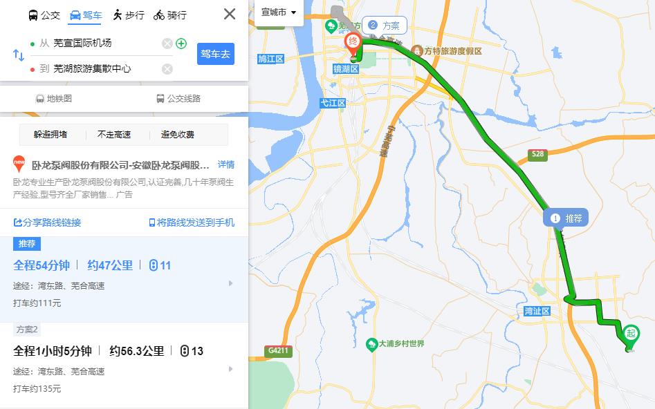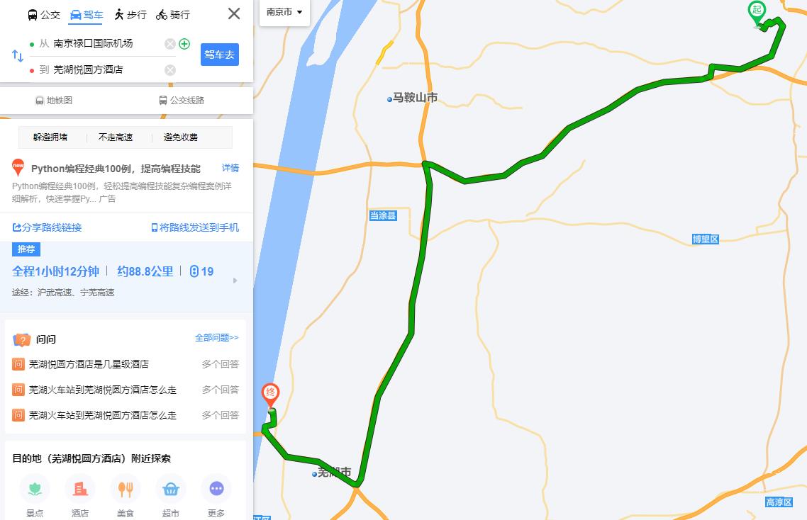 方式三:机场大巴(南京禄口机场至芜湖,约1小时50分钟,发车时间段11:30-22:00,车费65元)+打车(芜湖游客集散中心至芜湖悦圆方酒店,约15分钟,车费20元),全程耗时约2小时5分钟。