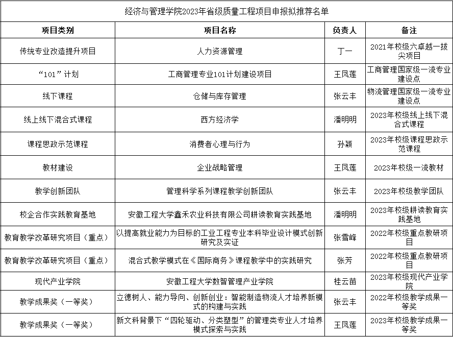 根据教务处《关于开展2023年度省级本科质量工程项目推荐工作的通知》要求,现将经济与管理学院2023年省级质量工程项目申报名单公示如下: