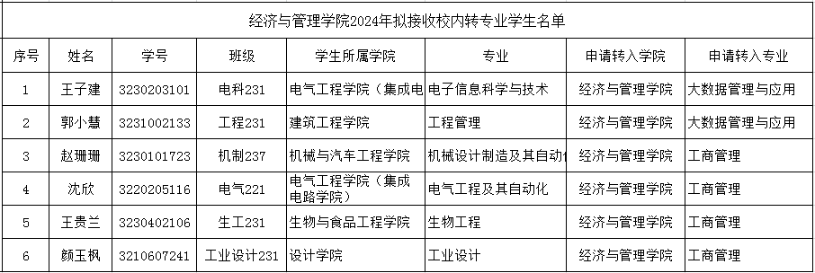 经济与管理学院2024年拟接收校内转专业学生名单公示