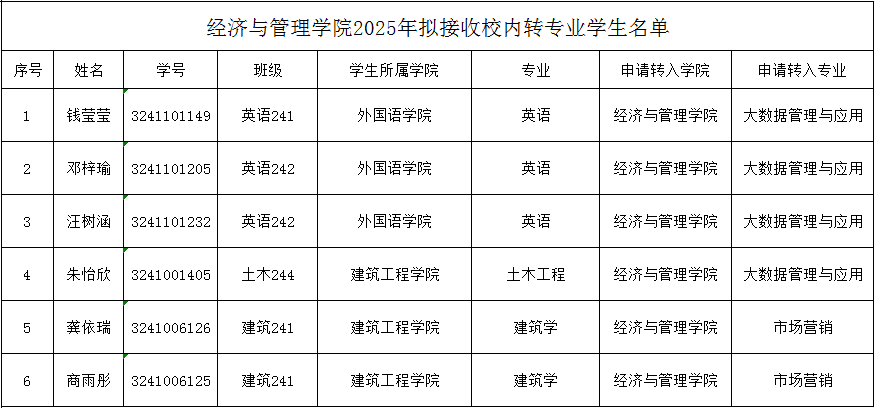 经济与管理学院2025年拟接收校内转专业学生名单公示