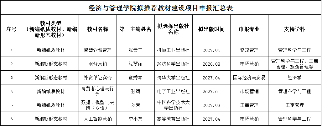 经济与管理学院校级教材建设(高水平教材培育)拟推荐项目公示
