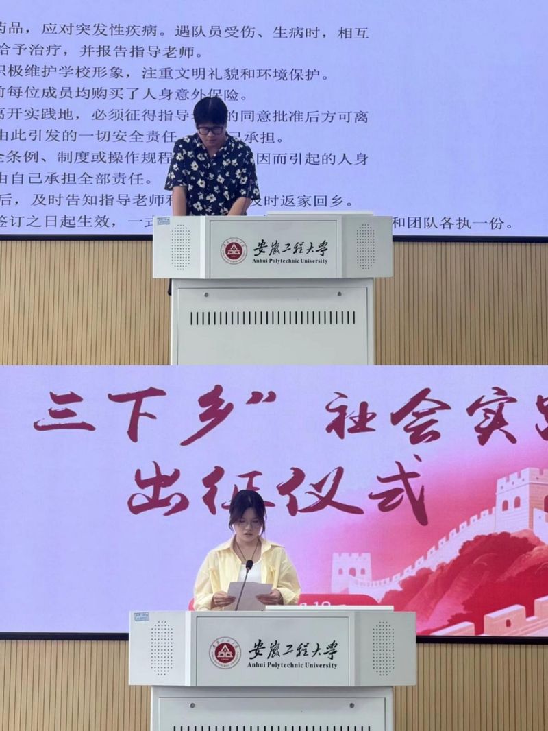 仪式上,赵恒梅详细解读了“三下乡”活动的申报要求、流程安排等事宜,重点说明了“三下乡”的项目如何开展,着重强调了活动中注意安全。学生代表赵忠宇就暑期社会实践要求作了安全承诺。“三下乡”实践团队代表许心蕊在发言中表示,“三下乡”不仅是一次简单的社会实践,更是我们青年学子将课堂所学知识运用到社会的宝贵契机,要怀揣坚定的信念和饱满的热情去完成这次成长之旅。