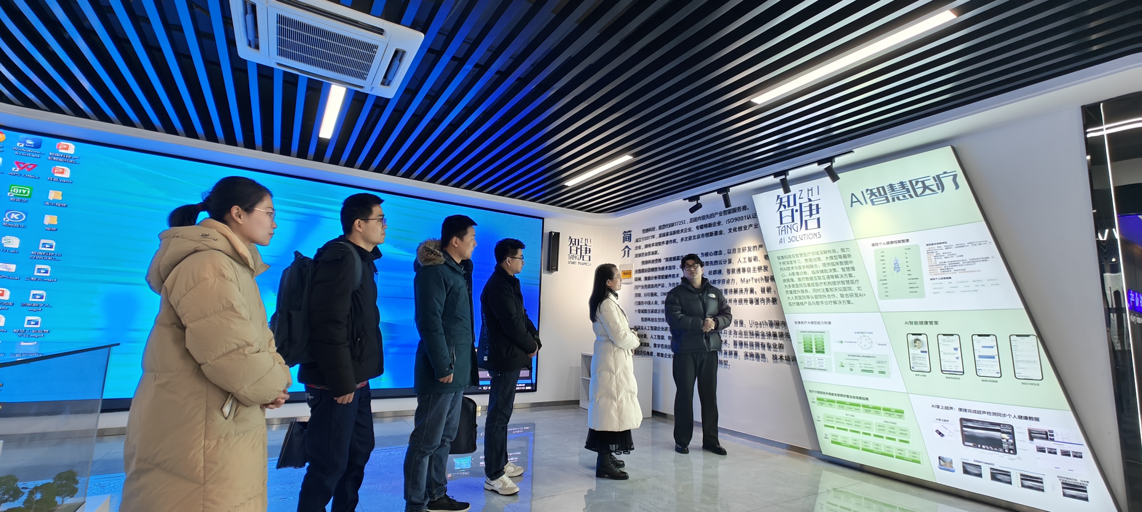 随后,刘涛一行来到芜湖智唐科技有限公司。该公司总经理夏雨昊带领大家参观了公司的成果展示中心。他介绍了公司在软件开发、技术服务等方面的业务进展,并着重讲解了公司在互联网信息服务领域的创新成果。刘涛表示,学院已在智慧医疗、大模型应用、信息安全等方面与智唐科技开展了深入合作,取得了初步成果,希望双方能够继续深化合作,学院愿意为智唐科技提供更多的技术支持和人才支撑,推动共同发展。