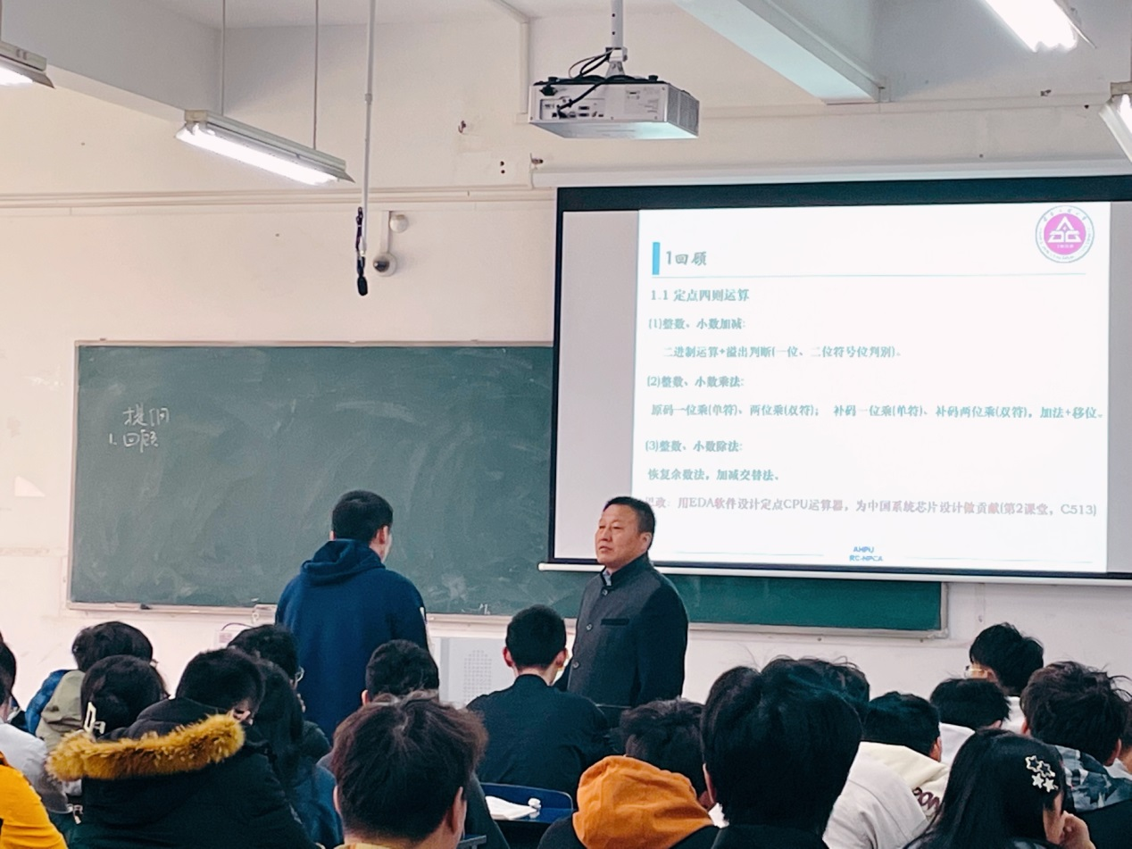本次授课内容是《浮点四则运算》,一开始陈乃金带领同学们回顾了定点四则运算的知识点,介绍了使用EDA工具设计定点CPU基本思路,同时鼓励学生要为中国系统芯片设计做出贡献,在定点四则运算的基础上自动衔接浮点四则运算的知识点,并通过不同案例按照层次递进的方式依次对浮点四则运算方法进行讲解。陈乃金采用启发式和学生互动相融合展开教学,课堂气氛活跃,把枯燥的知识点变得让学生容易接受,并对相关知识应用进行了扩展,使学生在接受知识的同时又激发了学生进一步研究该知识的兴趣。