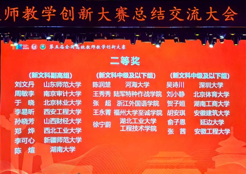 据悉,全国高校教师教学创新大赛是教育部高等教育司指导,中国高等教育学会主办的全国性最高级别的教师教学竞赛,实现全国省份全覆盖、本科高校全覆盖、学科门类全覆盖、各类教师全覆盖,体现我国高等教育教学改革的最新成果,具有十分广泛的影响力和示范辐射效应。本届大赛以“推动教学创新,培养一流人才”为主题,共有12.7万名教师参加校赛,3.4万名参加省赛,588门课程2253名教师入围国赛,分新工科、新文科、课程思政、产教融合等七个赛道,分设正高、副高、中级及以下3个组别。本届国赛共有88个教师(团队)获得一等奖、205个教师(团队)获得二等奖、295个教师(团队)获得三等奖。(文:李凯;图:张金轮;预审:张金轮;审核:夏登峰)