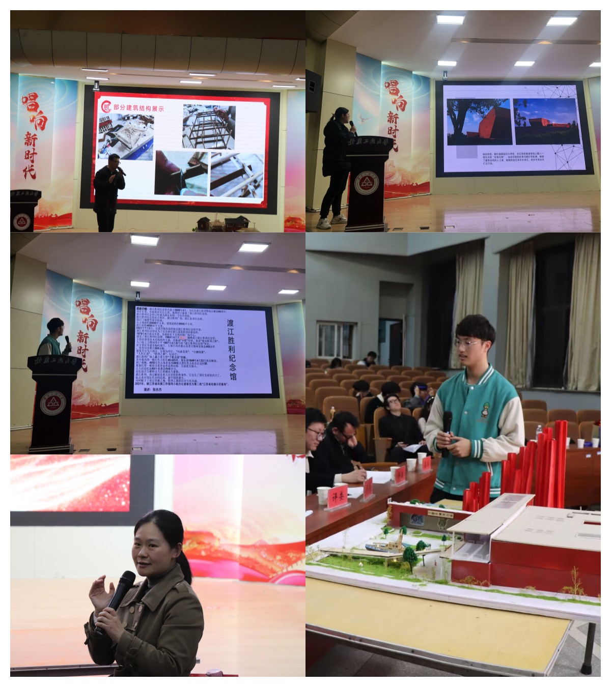 大赛以“寻访红色建筑,讲好红色故事”为主题,用红色建筑诠释中国共产党百年奋斗历程。大赛分为初赛、复赛、决赛三个阶段,历时三个多月,共吸引全校320多名学生参与,提交作品70余件。经过初赛,24件作品入围复赛,在C座实验楼前小广场举行了作品展,陆续有1000多名师生前往现场观看,参赛选手热情洋溢的介绍了自己的作品以及参加比赛的心路历程。通过现场答辩和线上点赞活动,专业组和非专业组共16件作品入围决赛。决赛分为作品展示和终审答辩两个环节。选手们通过PPT从作品简介、设计理念、方案构思、结构造型、功能布局、结构布置、造型、效果图、结构受力分析以及蕴含的红色建筑故事等方面进行介绍,给现场观众带来一堂鲜活的红色教育课程以及独特的红色视觉享受。