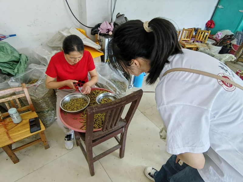 太阳实践队探访的第一站是六茗堂林农科技开发有限公司,这是一家以生产加工售卖霍山石斛为业务的公司。霍山石斛,被誉为“中华仙草”,是一种珍贵的中药材。我们了解到霍山石斛产业经历了从濒危物种到规模化种植的转变,现已成为当地乡村振兴和农民致富的主导产业。公司规模不大,石斛加工方式为人工和机器相结合,这体现了对石斛生产工艺的传承与创新,同时也带动了乡村留守人员的就业,解决了部分村民的工作问题。