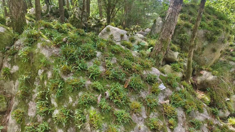 在六安市政府“打造西山药库,助力脱贫攻坚”的发展思路推动下,霍山石斛开发呈现强劲势头。进一步引导霍山石斛产业良性发展,将其培育为大别山革命老区的特色支柱产业,对其实现乡村振兴具有现实意义。踏入这片基地,首先映入眼帘的是郁郁葱葱的林木和点缀其间,布满米斛的岩石。与其他中草药的生长环境迥异,霍山米斛选择在坚硬的岩石上扎根生长,展现出其非凡的生长机制。负责人向团队介绍了这里得天独厚的自然条件、先进的米斛种植技术、精准的湿度调控措施及米斛独特的生长周期和专业的判断方法。每一项都透露着这片米斛种植基地的精心管理和其卓越品质。
