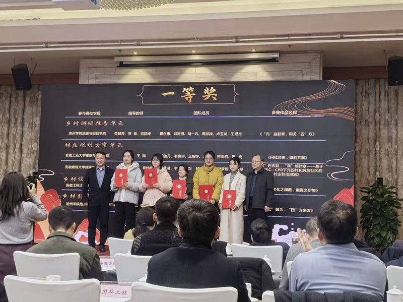 2025年3月3日,安徽省村镇建设学会2024年度工作会议暨学术交流活动在合肥召开,同时举行了第七届(2024年)安徽省高等院校大学生乡村规划建设方案竞赛颁奖仪式。我院建筑学专业学子虞于萱、赵月月、黄乾涛、王瑜明杰、李健强凭借参赛作品《寻洄——文化之渊薮,童真之伊甸》(指导教师李茜),荣获本次竞赛乡村设计方案单元的一等奖,为学院争得了殊荣。作品立足乡村实际情况与传统文化的保护与传承,紧扣现代乡村发展的需求,通过对乡土文化与研学教育空间的富有创意的规划设计,充分展现了团队扎实的专业功底和对乡村建设的热忱思考。此次获奖不仅为学院赢得了荣誉,也充分体现了我院学子的综合素养与创新实践能力的提升。