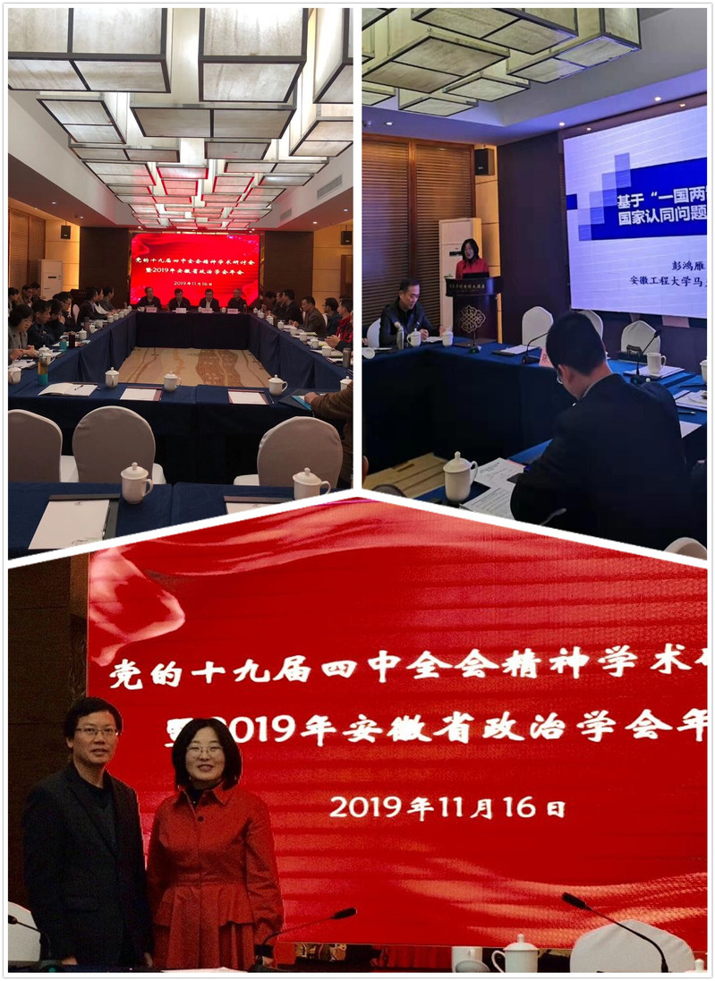 会议还安排有关专家学者对十九届四中全会精神进行专题研讨,来自安徽师范大学、安徽大学的专家学者,以及我校彭鸿雁教授、党校系统等有关专家先后做了主题发言。彭鸿雁教授的发言主题为《基于“一国两制”下的香港青年国家认同问题的思考》,她的报告关切热点、以问题为导向、视角独特、小中见大、论证严密,受到与会专家一致好评。