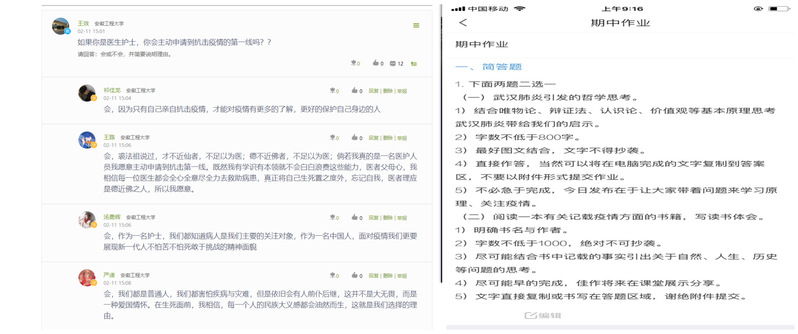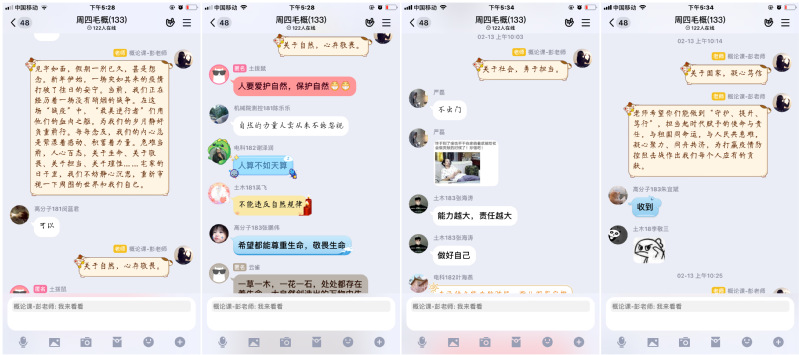 线上教学中,教师们将防疫抗疫中涌现出的先进人物、典型事迹作为教学案例和鲜活素材融入教学,厚植爱国主义情怀,教育引导学生遵守规则、热爱生命。王效老师在开学第一课利用“如果你是医生护士,你会主动申请抗击疫情的第一线吗?”的话题,引导学生通过角色转换,表达对抗战在疫情第一线的医护人员的崇高敬意。毛加兴老师充分挖掘疫情与原理课程的结合点,引导学生关注疫情,思考疫情背后的哲理。彭鸿雁老师组织“战‘役’,我们在一起”专题教学,引导学生们思考关于生命、关于敬畏、关于担当、关于理性……教育学生担当起时代赋予的使命与责任,为打赢疫情防控阻击战作出自己的贡献。