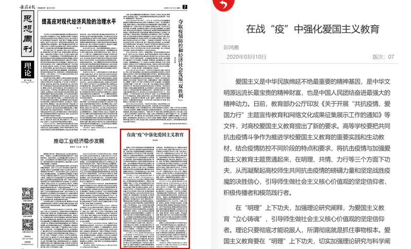 2020年3月至4月,《安徽日报》理论版连续刊发2篇我校教师专业理论文章,分别是苏国红教授的《在抗疫中彰显共产党人价值追求》和彭鸿雁教授的《在战“疫”中强化爱国主义教育》。文章发表后,已先后被学习强国、学习安徽网、安徽文明网、中工网等媒体全文转载。