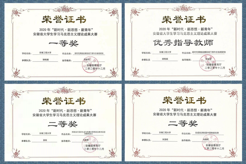 “新时代•新思想•新青年”安徽省大学生学习马克思主义理论成果大赛是我省马克思主义理论学科唯一的大学生学科与技能竞赛。本赛事由安徽省教育厅主办、合肥工业大学承办,此次比赛旨在用习近平新时代中国特色社会主义思想铸魂育人,积极构建与课堂教学相互促进的思想政治理论课第二课堂教学体系,深入实施大学生马克思主义理论自主学习行动计划,增强学生学习思政课的积极性、主动性和创造性,不断增强学生对思政课的获得感,打牢学生成长成才的科学思想基础,展现新时代大学生的马克思主义理论素养和精神风貌。此次比赛获奖,展示了马克思主义学院师生良好的学术素养。