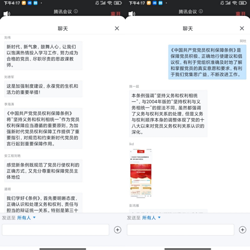 研讨活动中,李海涛首先带领大家学习了上述5个文件的重点内容,并请党支部成员就《中国共产党党员权利保障条例》发表心得体会。大家认为,《中国共产党党员权利保障条例》坚持了习近平新时代中国特色社会主义思想的指导地位,贯彻了新时代党的建设总要求,充分体现了党中央对保障党员权利的科学认识。它的发布,是中国共产党加强制度建设、永葆生机和活力的重要举措,为加强新时代党员权利保障工作提供了重要指引,对规范和约束党员的言行起到重要保障作用。此次线上专题研讨加深了支部成员对党员义务与权利、责任与担当、行使权利与遵守纪律之间关系的认识,为支部成员按照《中国共产党党员权利保障条例》的规定,正确履行党员义务、充分行使党员权利发挥了积极作用。