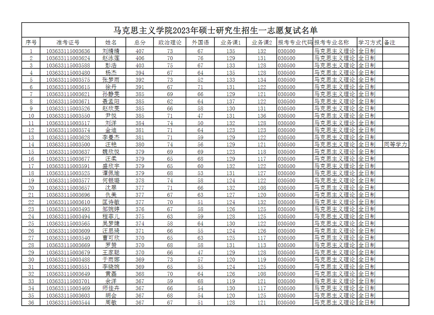 马克思主义学院2023年硕士研究生招生一志愿复试名单