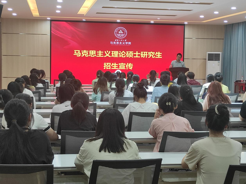 在研究生招生宣讲活动中,李海涛向在场的100多名学生详细介绍了我校的办学理念、办学特色、学习环境,重点介绍了我校马克思主义理论硕士点的专业特色、研究生培养方案、师资力量等,细心解答了学生特别关心的考试科目、未来就业选择和奖助体系等情况,反响强烈。