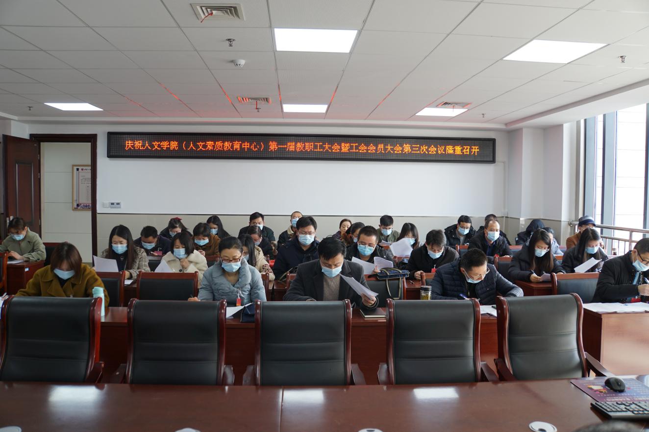 1月20日,人文学院第一届教职工大会暨工会会员大会第三次会议在图书综合楼1307会议室召开,学院全体教职工、工会会员参加会议。