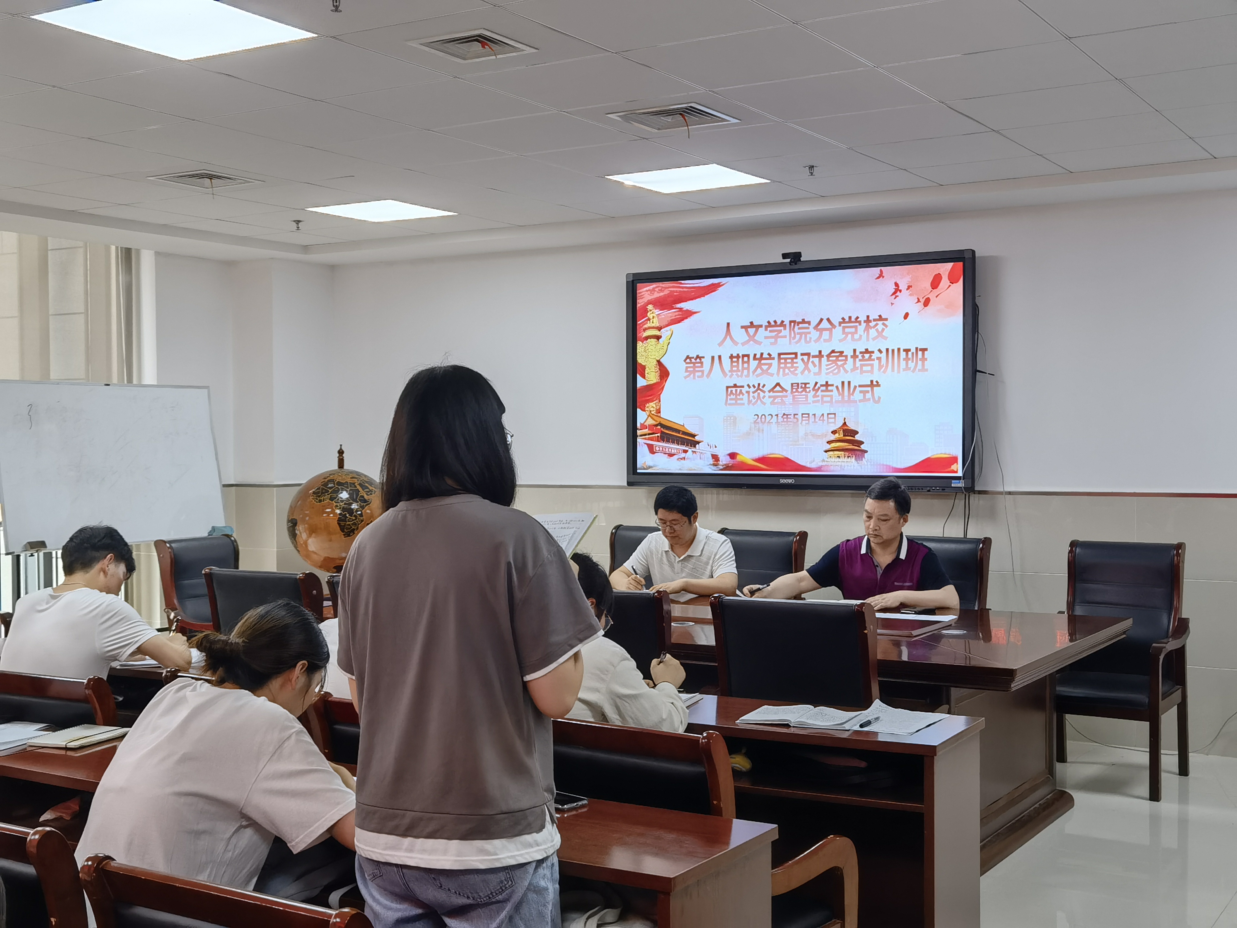 为巩固发展对象培训班学员理论学习成果,推动党史学习教育,2021年5月14日,人文学院分党校在学院1307会议室举行第八期发展对象培训班座谈会暨结业式。院党委书记邓英扣、培训班班主任、及培训班全体学员共同参会。邓英扣主持会议。