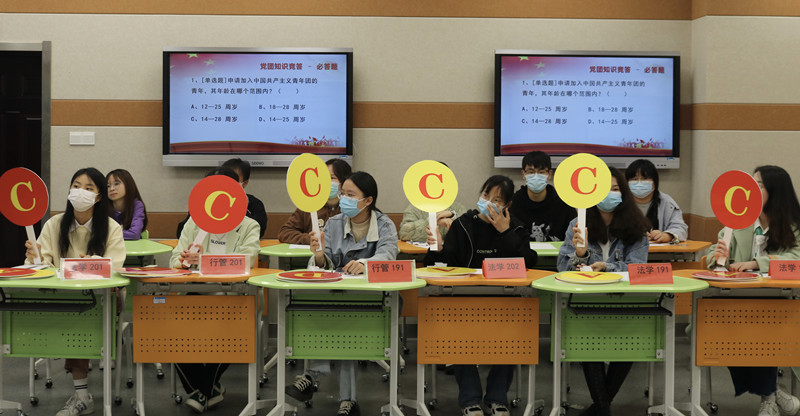 考虑到疫情防控要求,决赛分为线上、线下两个会场。本次比赛主要分为三个阶段。第一阶段,各参评团支部分别从班子建设、团员管理、活动开展、制度落实、作用发挥等五个方面对支部的重点举措、特色成效与日常工作进行介绍与展示。第二阶段,各支部以朗诵、视频、诗歌等多种形式展示了团员青年的青春活力与昂扬的斗志,考虑到疫情防控要求比赛现场播放部分团支部才艺视频。第三阶段,知识竞答采用必答+抢答相结合的形式,各团支部参赛同学积极抢答,现场竞争热烈。