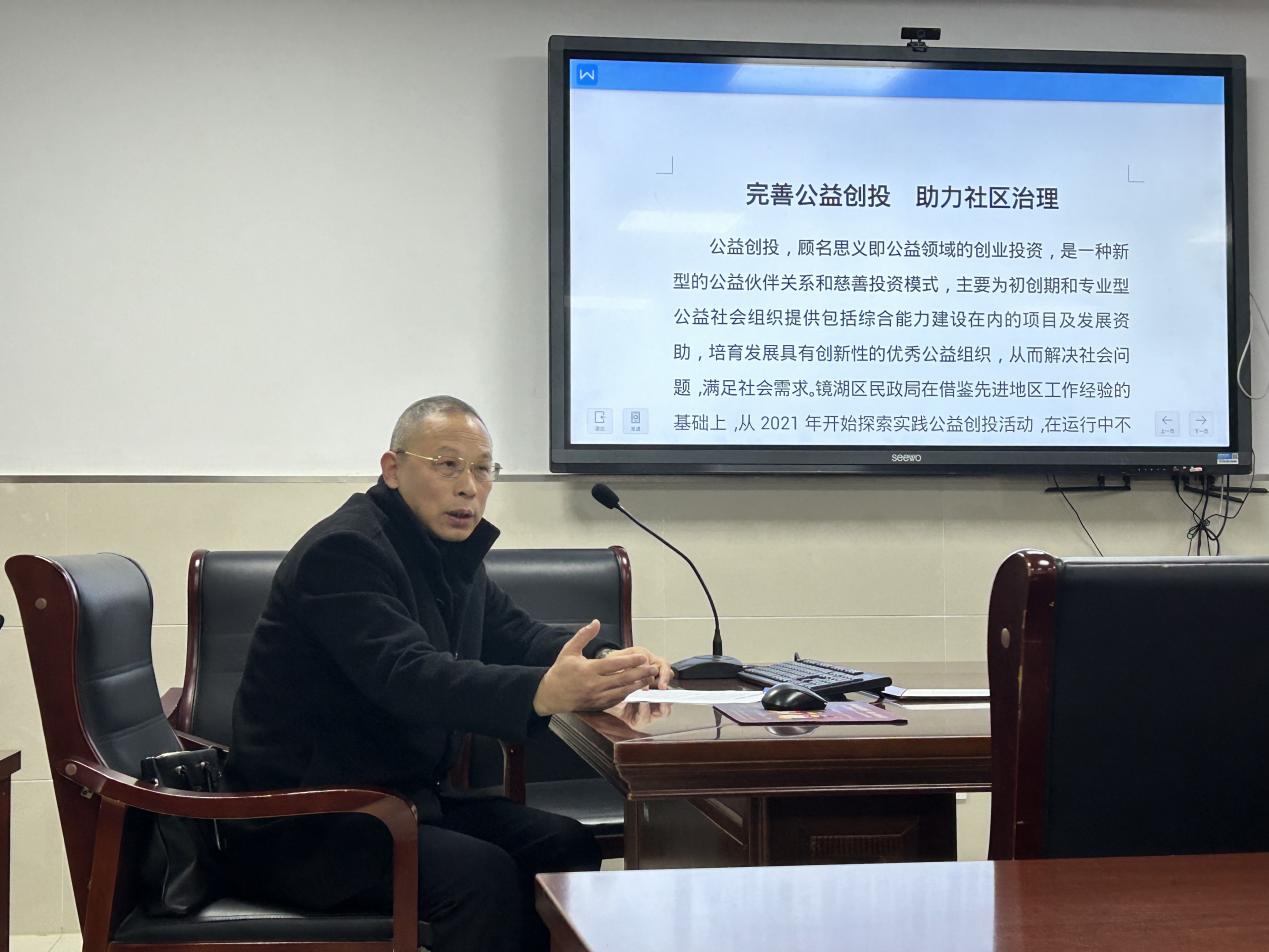 侯斌以“完善公益创投 助力社区治理”为题,从公益创投的具体内涵切入,围绕现阶段区民政局在公益创投活动中的做法、成效和工作建议三个方面进行阐述。首先,总结了征集需求、优化项目、强化督导、健全机制的四个做法。其次,他结合具体做法,对公益创投实践的成效进行了具体阐述。最后,他对公益创投今后的活动提出了工作建议。