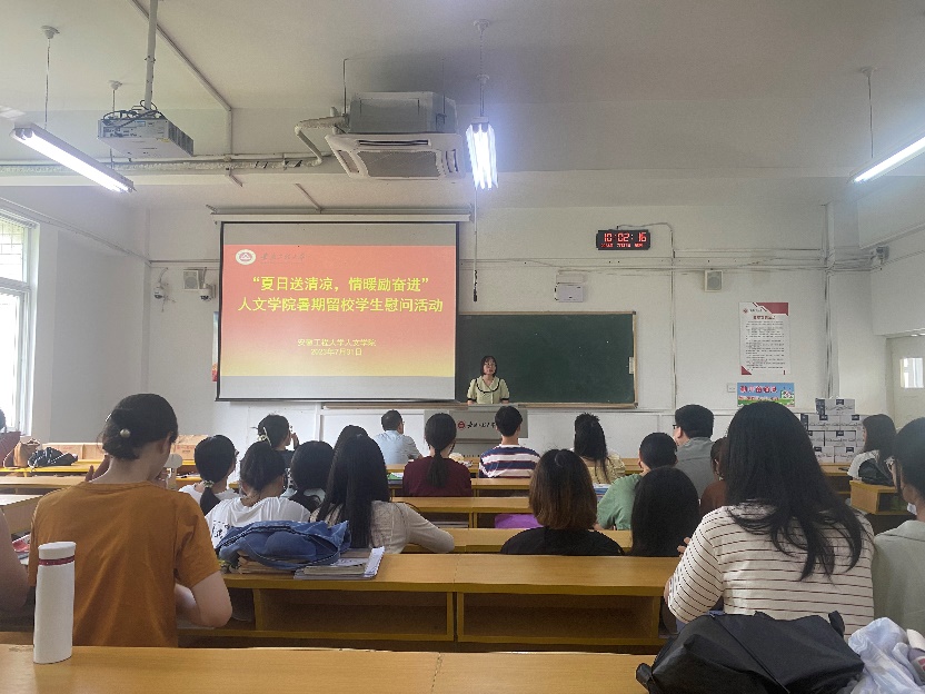 为进一步落实学校《关于加强暑期留校学生教育管理的通知》要求,推深做实“三全六专”育人实践,切实把对留校学生的人文关怀落实做细,7月31日,人文学院在4J108举办“夏日送清凉,情暖励奋进”暑期留校学生慰问活动。学院党委副书记王中江,辅导员代表章雪平,全体暑期留校本科生和研究生参加了本次活动。活动由学院团委副书记利昕云主持。