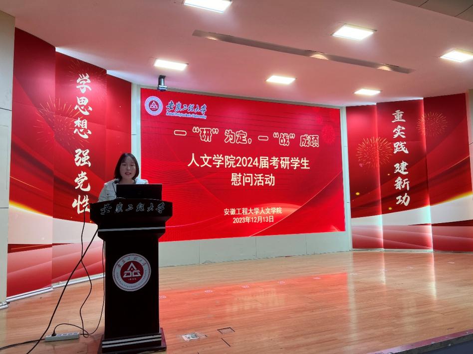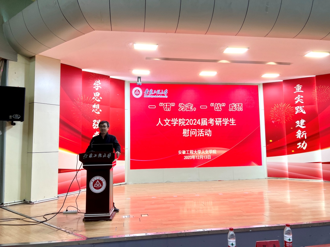 在2024年全国硕士研究生招生考试即将到来之际,为缓解备考压力,坚定考研信心,12月13日下午,人文学院在学术报告厅开展2024届考研学生慰问活动。人文学院党委书记刘一、副院长张勇、副院长邹俊、毕业班辅导员章雪平,以及2024届全体考研学生参加了本次活动。活动由学院团委副书记利昕云主持。