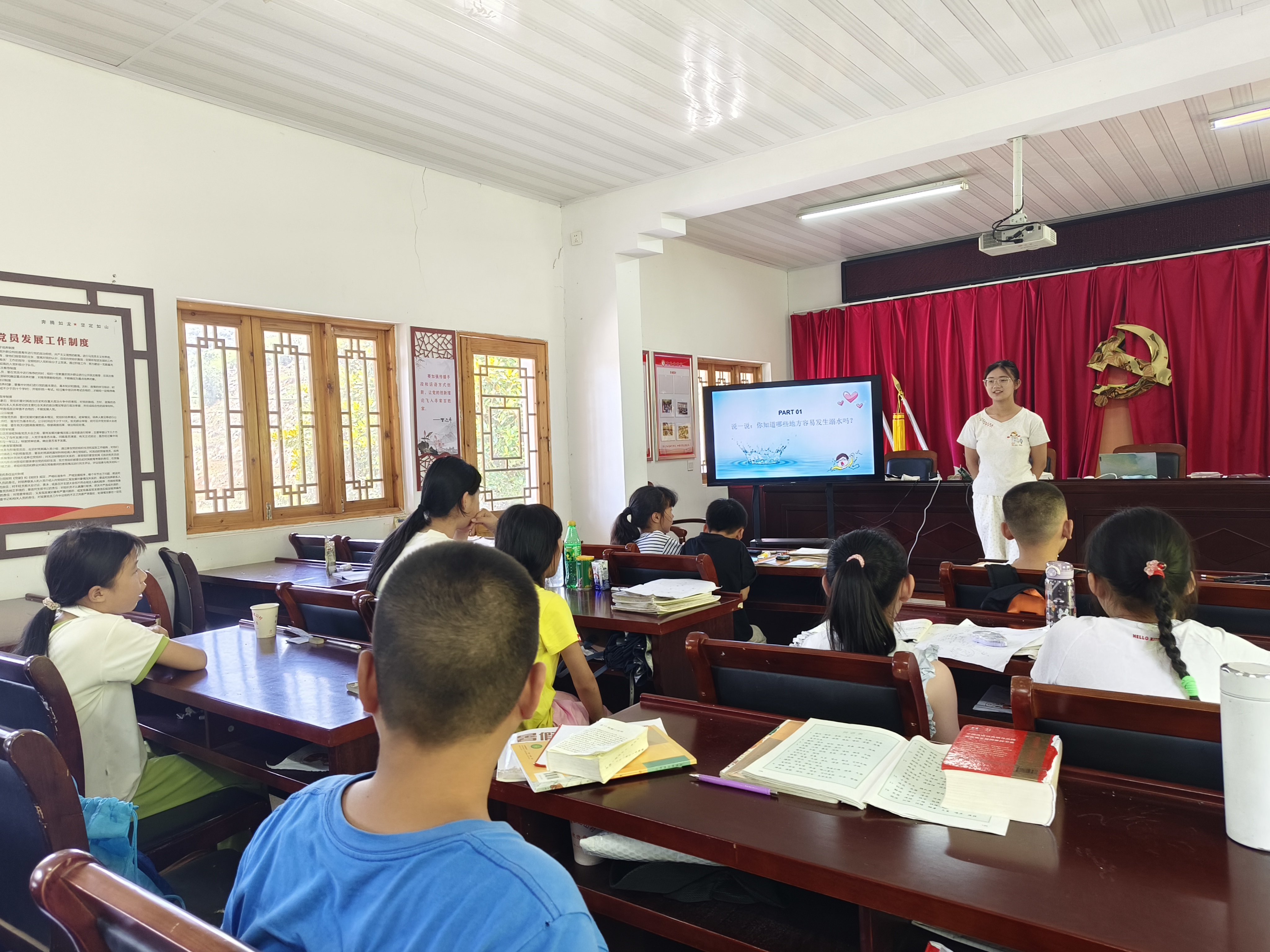 依托龙山村“暑期爱心学堂”,调研团开设了防溺水安全教育课堂,通过播放防溺水安全教育动画片,结合知识竞赛、情景模拟演练等互动形式,帮助青少年了解防溺水知识、提高防溺水意识、掌握自救技能。