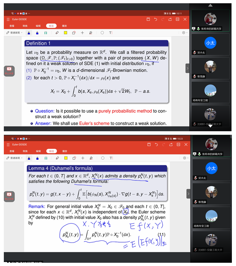1月20日上午,应数理与金融学院邀请,武汉大学博士生导师、数学与统计学院副院长张希承教授应邀以腾讯会议的方式为数理与金融学院作了题为《Euler scheme for density dependent stochastic differential equations》的学术报告。报告会议由学院副院长吴小太主持,相关方向的教师与研究生聆听了本次学术报告会。
