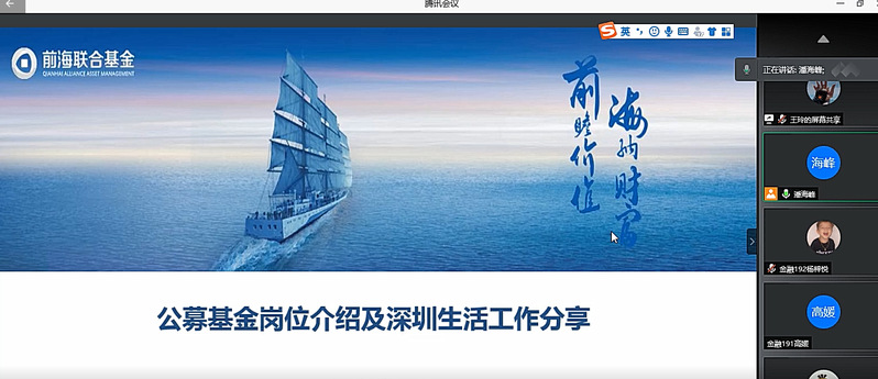 5月15日晚上,金融工程系邀请了深圳前海联合基金产品经理王玲,为同学们举办了主题为《公募基金公司岗位介绍及深圳生活工作分享》的线上讲座。金融工程、互联网金融专业各年级200余名同学参加。王经理从公募基金公司的部门设置、岗位工作内容、岗位要求等方面进行了详细介绍,并就在深圳的工作生活感悟与同学们进行了分享和交流。