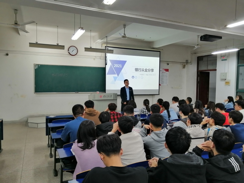 4月28日晚上,邀请了中信银行(芜湖)田遥经理,为同学们举办了主题为《银行从业分享》的讲座。金融工程专业18级110余名同学参加。讲座在6教213举行。田经理从中国银行业概况及展望、商业银行业务及内部机构设置、主要岗位介绍及未来发展空间、职业发展规划及知识储备的建议等方面进行了系统介绍。