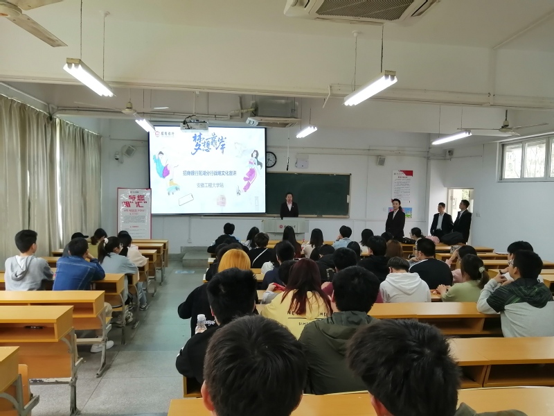 4月28日下午,邀请了招商银行(芜湖)人力资源部的团队,为同学们就商业银行机构体系、岗位设置、岗位要求等进行了系统介绍,金融工程专业17级40余名同学参加。讲座在4教109举行。