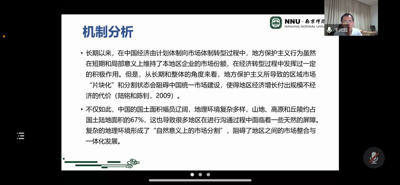 首先,卞元超教授阐述了市场整合方面的研究背景,指出在国内市场中培育企业自主创新能力提升的动力源泉,成为中国建设创新型国家进程中必须关注并解决的关键问题之一。随后,分析了中国的区域市场的整合度趋势,并详细构建了区域市场整合的数学模型以及采用2002-2013年中国工业企业省级数据进行匹配分析。最后,卞教授还对相关影响机制进行了检验。