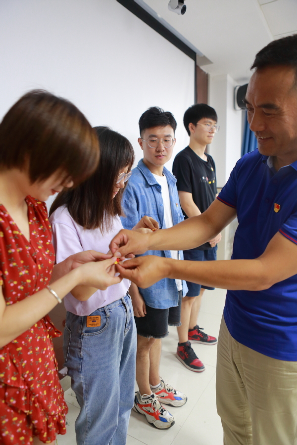 仪式在齐唱国歌声中拉开了帷幕,全体党员在支部宣传委员周恒梅同志的带领下,面向党旗,举起右拳,向党组织立下了铮铮誓言。周毅仁同志为新党员佩戴党员徽章。