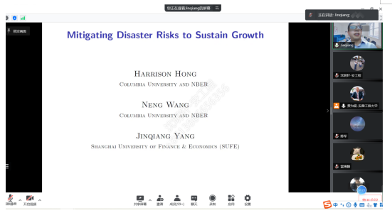 杨金强教授作了题为《Mitigating Disaster Risks to Sustain Growth》的报告。从灾难对及经济社会的影响出发讨论了减灾及预防灾难发生的必要性。通过分析已有文献的不足及经验政策的影响,提出了减灾模型,并详细解释了变量的经济含义。在给定效用函数的条件下,通过求解HJB方程,给出了模型的最优解,并给出了数值仿真例子说明了该理论。