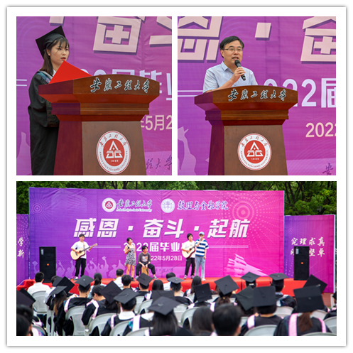 典礼上,学院党委书记周毅仁作了题为《与你们的约定》的致辞,哽咽着和大家分享自己见证的18级的四年学习生活中努力进步的点点滴滴,深情寄语全体毕业生“青春心向党,阔步新时代”,秉承“尚德敏学 唯实惟新”的校训和“究理求真 刚毅坚卓”的院训,定能实现“大鹏一日同风起,扶摇直上九万里”的志向,与2022届毕业生立下特别约定,向同学们发出了盛情邀请,常回“家”看看。由张伟、史龙梅、蒋书云、程安琪等四位老师与学生代表共同朗诵的2022届毕业生汪炜桀同学的原创诗歌《相信未来》,讲述了四年的师生情谊,既饱含老师们的深情寄语与殷殷期望,也表达同学们的奋斗决心和人生梦想。张玥老师说,“从教几十年,能清楚记得很多孩子的在校情况,孩子们毕业了在外面好不好,都愿意打电话说一说,这就是身为老师的最大幸福。”史龙梅老师说,“我是一名新教师,从学生到老师的角色转变,我受教于学院老教师手把手的‘传帮带’,同时也时常被学生们感动着,一声‘辛苦了’、一朵鲜花,让我感到很温暖。老师永远祝福你们,你们是最好的未来!”