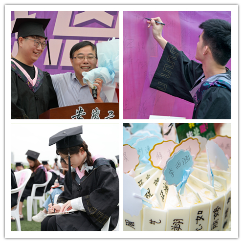 典礼在雄浑激昂、催人奋进的国歌声中拉开序幕。学院党委书记周毅仁代表全院师生向全体毕业生表示热烈祝贺并送上真挚的寄语。副院长吴小太主持扶正流苏仪式,现场199名同学有序上台,学院党委委员、系主任潘海峰,学院纪委委员、系主任张玥,学院党委委员周金明等一起为同学扶正流苏。毕业门、签名墙、“未来可期 属你最棒”的毕业纪念品、“写给十年后自己的一封信”、“向老师献花”、“感恩父母”、“有229个名字的蛋糕”……每一个环节都有精心设计的满满仪式感。统计181李嫚嫚说“大学期间受到了老师和同学们的很多帮助和照顾,跟老师提到要写下自己的十年约定,就在今天实现了,很激动也很感动,自己将永远铭记,安工程给了自己一路前进的动力和信心。”