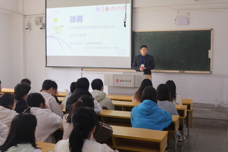2001级校友徐勇担任宁波均联智行科技股份有限公司IT经理,他向大家分享了个人的教育经历和实习经历,表示在学生时代,大家要提高学习思维能力和语言交流能力,为未来职业发展提供坚实基础,找到自己的闪光点。
