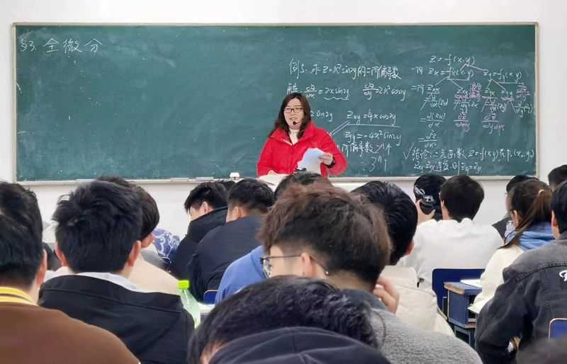 杨迎娟老师两节课讲述了多元函数的全微分,包括二元函数的偏导数,偏导连续、可微、连续、偏导存在以及二重极限之间的关系等内容。课堂上,杨老师讲解逻辑清晰,声音悦耳,内容流畅,板书布局与进程契合;机制22级的同学们注意力集中,全程跟进老师讲解、互动交流有问有答。