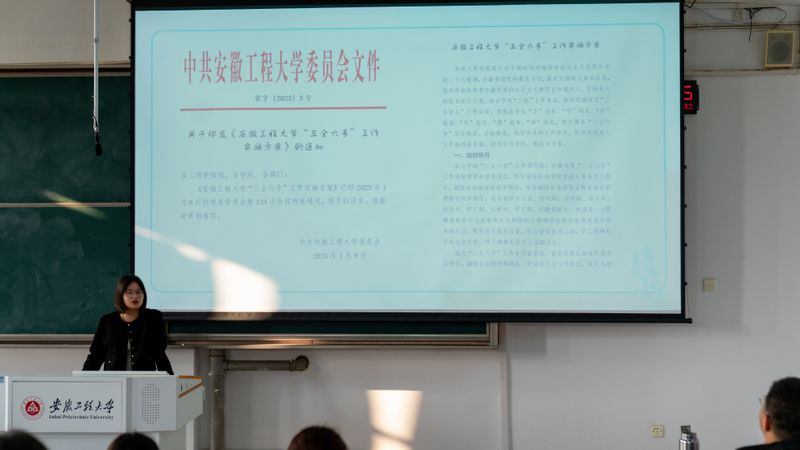 张犇介绍了学校和学院“三全六专”工作实施方案,汇报了学院宿舍检查督查、宿舍分级评议、宿舍文化节、学生宿舍自我教育管理、和谐学生社区工作站运行等一年来“和谐宿舍”创建成效,指出宿舍是开展育人工作的基础阵地,促进和保障学生健康的重要环境,希望同学们深入参与“和谐宿舍”创建,养成良好的学习和生活习惯,争做“六专”青年。