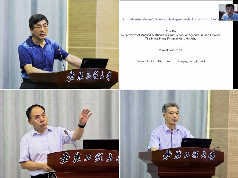 研讨会分三个阶段进行。第一阶段由丁晓东、安徽师范大学党委常委、副校长任永教授主持。爱丁堡皇家学会院士、英国思克莱德大学毛学荣教授,香港理工大学戴民教授,宁夏大学副校长/北京航空航天大学王青云教授,华中科技大学关治洪教授,分别以《Stabilisation in distribution of hybrid systems by intermittent noise》《Equilibrium mean-variance strategy with transaction costs》《融合神经动力学计算的运动控制的新范式》《混杂智能系统的自主性研究》为题作主题报告。