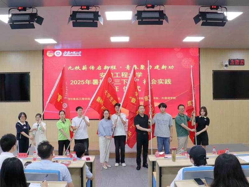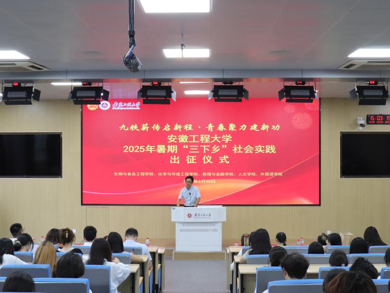6月20日下午,我校2025年大学生暑期“三下乡”社会实践出征仪式在5J217教室举行。生物与食品工程学院、化学与环境工程学院、数理与金融学院、人文学院和外国语学院联合承办。校团委、相关学院负责人,学院团委书记,辅导员和实践团队学生代表参加仪式。