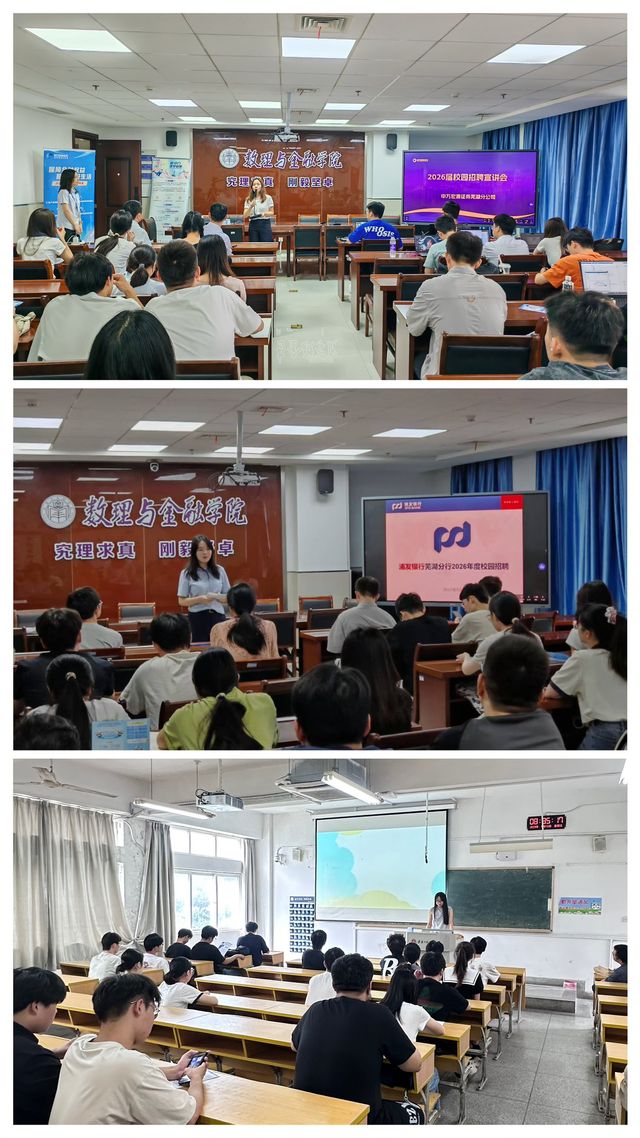 为搭建毕业生与优质用人单位的高效对接平台,数理与金融学院于9月11日至23日先后邀请申万宏源证券有限公司、浦发银行芜湖分行、安徽尚层网络科技有限公司三家知名企业走进校园,面向学院2026届毕业生开展招聘宣讲,为毕业生提供了大量高质量就业岗位。