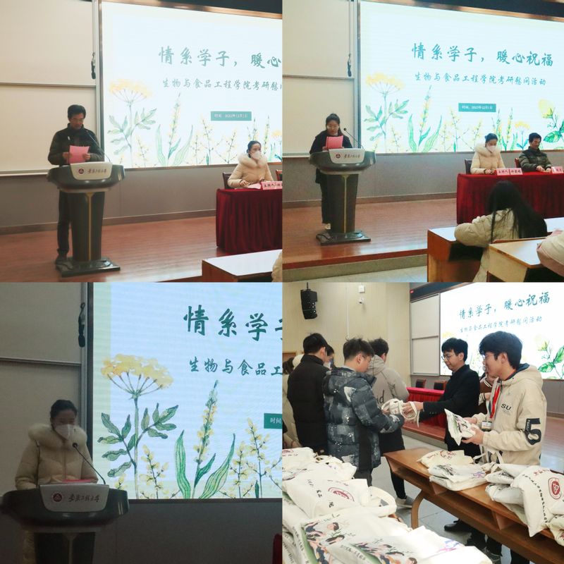 12月1日,学院举办“情系学子 暖心祝福”考研心理慰问活动,学院党委书记余传文、辅导员李良渊及2024届全体考研备考生参加本次活动。余传文与同学们重温了学院2023届本科毕业生考研的喜讯,鼓励同学们不忘考研初心,主动将个人理想追求融入到民族复兴的伟大征程中,在最艰难困苦的冲刺阶段保持耐心,认真复习,积极备考。生制202班朱丹丹代表学院2024届全体考研备考生进行发言表态。活动现场还播放了由各系部教师代表、学院辅导员代表、低年级学生代表共同参与录制的考研祝福视频,预祝所有考生旗开得胜、金榜题名。最后,李良渊和钟莉娟现场为全体备考生分发了慰问品。