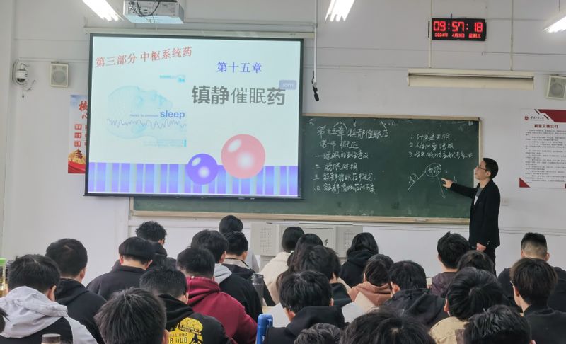 本次示范课由钱森和老师主讲,授课章节为《药理学》第十五章镇静催眠药。钱老师以微视频《什么是失眠》导入,并提出人为什么会睡眠、当你出现失眠时怎么应对等问题,引发同学们的思考,展开本章节的讲授。钱老师以典型的镇静催眠药——地西泮(安定)为代表,讲述了其体内吸收、药理作用、临床应用以及不良反应等。他在讲授过程中结合缺乏睡眠对人大脑和机体的损伤作用开展德育教育,倡议学生在学习和生活过程中养成规律作息的习惯,才能保持身心健康。钱老师在教学过程中通过问题导入方式与学生开展互动,激发学生兴趣,培养学生分析、解决问题的能力,课堂气氛活跃,教学效果良好。