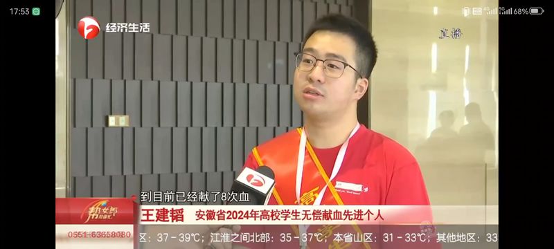 王建韬同学在接受安徽电视台采访时说到,“作为一名共青团员,我深知,每一次献血都可能是他人生命的希望,每一份付出都是对社会的回报。我将继续发挥模范带头作用,为推动无偿献血事业的发展贡献自己的力量。”