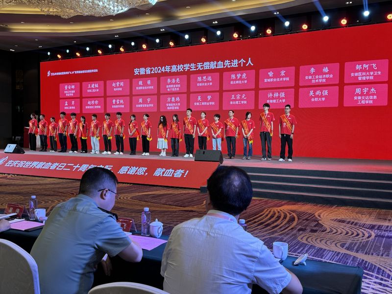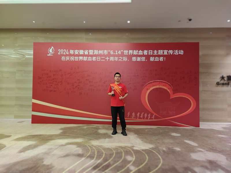 2024年6月14日是“世界献血者日”20周年。6月12日,由安徽省卫生健康委员会、安徽省红十字会等八家单位联合主办的“安徽省2024年无偿献血公益之星与先进集体评选活动”圆满落幕。我校生物与食品工程学院生物工程专业王建韬同学荣获“安徽省2024年高校学生无偿献血先进个人”荣誉称号。