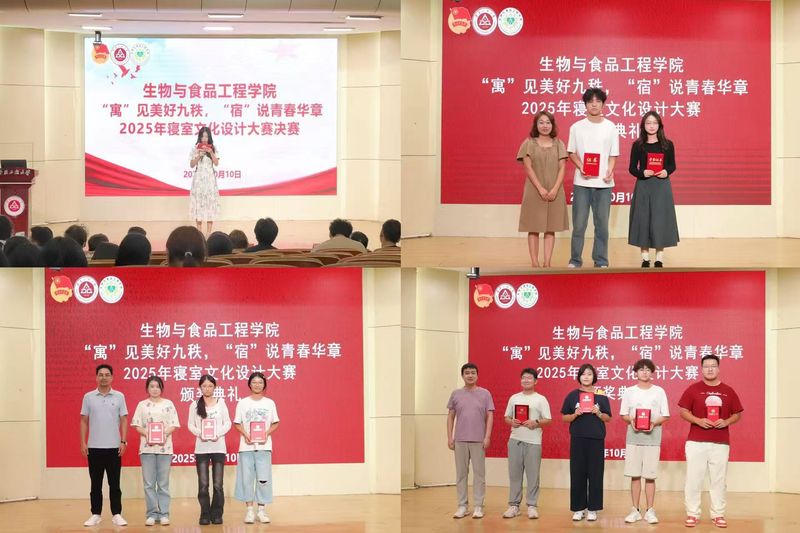 10月10日晚,生物与食品工程学院“‘寓’见美好九秩,‘宿’说青春华章”2025年寝室文化设计大赛决赛在学术报告厅顺利举行。学院团委书记何祥玲、辅导员杨良军和李闯出席并担任评委。经现场评审,男14-404等3个寝室获一等奖,男14-620等4个寝室获二等奖,女3-106等4个寝室获三等奖。